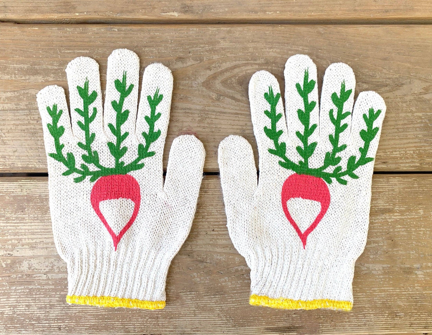 One the front, adorable red radishes with beautiful decorative green leaves reaching up each finger, on the other a cute dotted grip pattern to help grab the most noxious of weeds.