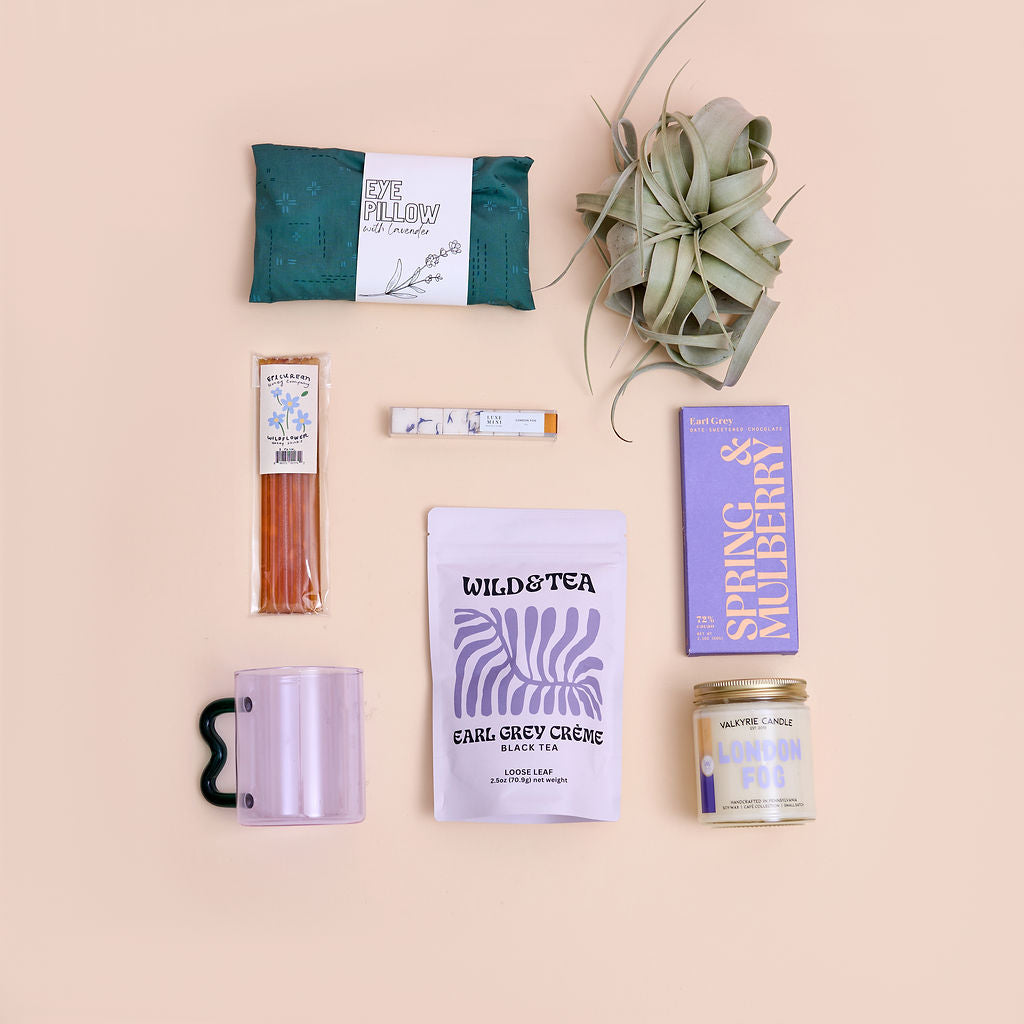 There's something about a warm cup of Earl Grey that makes the whole world feel a little softer. The bergamot, the steam, the ritual of wrapping your hands around a good mug—it's one of life's small, underrated pleasures. The London Fog gift box bottles that feeling and gives it a bow. Inside you'll find a striking Tillandsia Xerographica air plant, a London Fog soy candle, an aromatherapy weighted eye pillow, a wiggle glass mug made for slow mornings, and a carefully curated collection of small-batch Earl Grey tea, bergamot chocolate, honey sticks, and barista sugar cubes from independent makers we genuinely love.