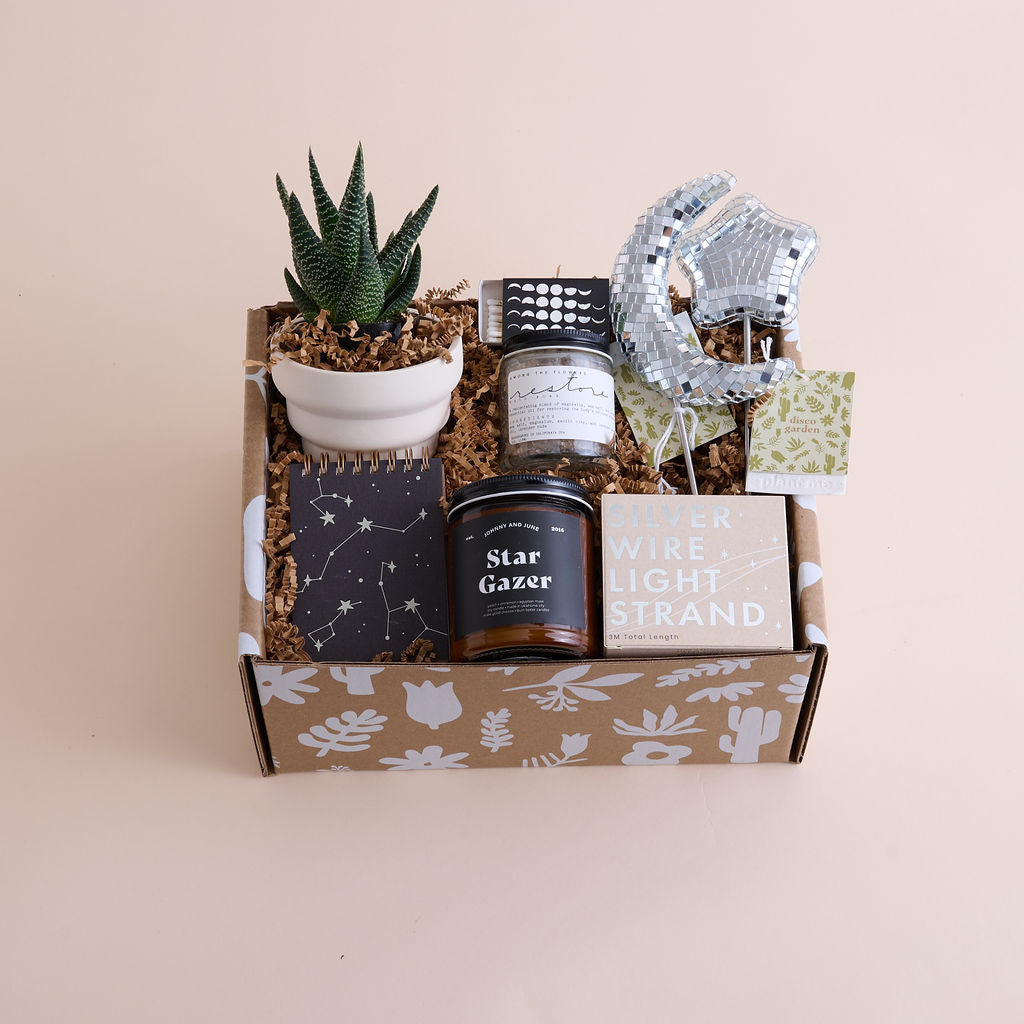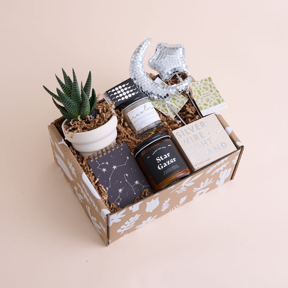You'll find something for everyone in our carefully curated selection of plant gifts. Our New Moon gift box showcases a stunning assortment of lunar-inspired gifts and live succulent plants, symbolizing new beginnings and growth. Gift the Cactus Cheers box when sending a thank you or popping some bubbly in celebration of someone. While our Olive Always gift box features elegant, Olive-themed gifts, symbolizing peace and longevity, sure to delight when you're in need of hostess gifts or client appreciation gifts. For new neighbors and moving celebrations, The Plant Bungalow gift box will give them all the tools they need to build their own indoor jungle and vibrant oasis in their new space.