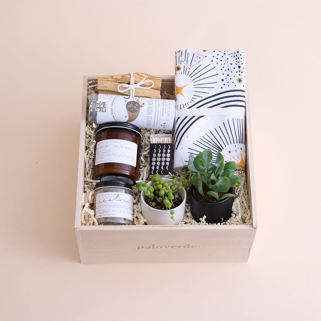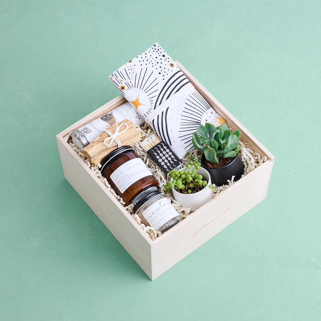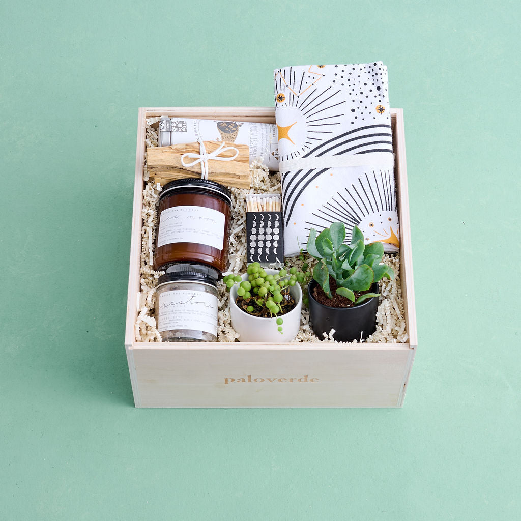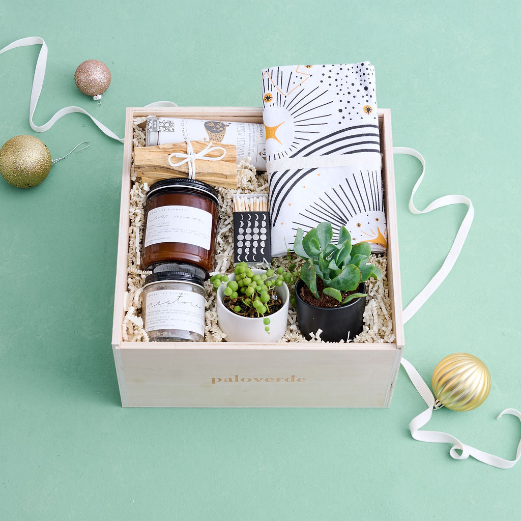Give the gift of our most luxurious unboxing experience with our signature wooden gift box featuring a slide top opening and laser etched Paloverde logo and enclosed with our metallic gold botanical print tissue paper--designed to be loved, gifted, regifted, repurposed, and more. Inside, your gifts are enclosed with kraft tissue paper and cushioned with matching ivory crinkle paper that can be composted or recycled after use.